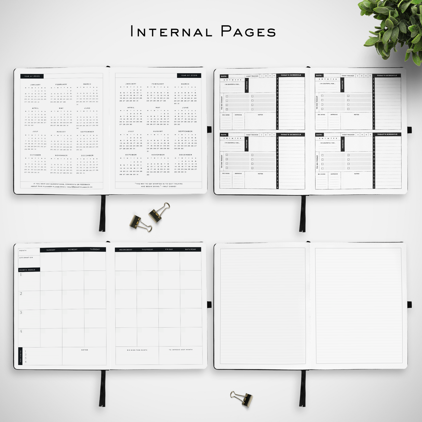 - Key Pages: Daily and weekly planning sections, yearly reference calendars and blank pages for notes.